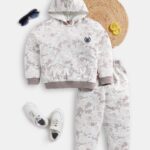 This trendy brown printed clothing set includes a soft sweatshirt and matching joggers, designed for comfort and everyday style. The sweatshirt features a hood, long sleeves, ribbed hem, and two kangaroo pockets for added convenience. The joggers come with a slip-on closure, offering a relaxed fit and easy wearability. Crafted from pure cotton, this set provides breathability, softness, and all-day comfort, making it perfect for casual outings, playtime, or lounging.