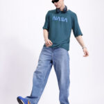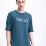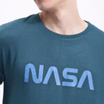men’s NASA printed t-shirt, blue NASA logo tee, regular fit crew neck t-shirt, casual short sleeve space-themed t-shirt, viscose NASA print top for men, everyday casual space t-shirt, trendy NASA graphic tee for men, medium length printed t-shirt, soft breathable crew neck t-shirt, men’s space fan apparel.