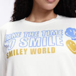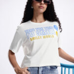 Smiley World crop t-shirt women, white typography printed crop top, boxy fit crop t-shirt women, Smiley World slogan tee, white and gold graphic t-shirt, blue print crop top women, viscose rayon crop t-shirt, drop shoulder crop t-shirt women, Smiley World fashion top