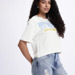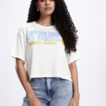 Add a cheerful twist to your everyday style with this Smiley World Typography Printed Crop T-shirt for women. Designed in a refreshing white base with gold and blue typography print, this crop tee radiates positivity and trendiness. The boxy fit and drop-shoulder sleeves create a relaxed silhouette that’s effortlessly stylish, while the cropped length gives it a youthful, fashion-forward edge. Crafted from soft knitted viscose rayon fabric, it offers exceptional comfort and breathability, making it ideal for casual outings, relaxed weekends, or lounging at home.