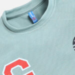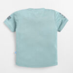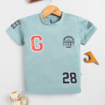 Green T-shirt for boys featuring a sporty placement print. Designed with a round neck, short regular sleeves, and a regular length, this tee is made from a soft cotton-polyester blend knitted fabric for comfort, breathability, and durability. Perfect for casual wear with an athletic touch.
