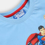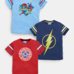 Assorted set of 3 T-shirts for boys featuring Justice League superhero prints. Each T-shirt is designed with a round neck, short regular sleeves, and a regular length for casual everyday wear. Made from soft knitted cotton fabric, these tees are comfortable, breathable, and ready to wear. Disclaimer: The final product delivered may vary in colour and prints from the display.