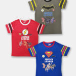 A set of three assorted T-shirts for boys featuring **Justice League superhero-inspired solid and printed designs**. Each T-shirt is crafted from soft knitted pure cotton fabric with a classic round neck, short regular sleeves, and a regular length for maximum comfort and easy styling. Perfect for casual outings and everyday wear.