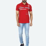 Let him step out in style with this Men’s Geometric Printed Polo Collar Pure Cotton T-shirt. Crafted from soft pure cotton fabric, this red T-shirt features a polo collar, short sleeves, and a regular hem for a comfortable fit. Designed with a button closure and regular length, it ensures ease and everyday comfort.