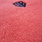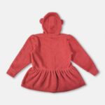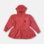 Red and yellow solid sweatshirt, has a hood, flare at hemline, long sleeves, zip closure, and curved hem