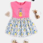 This pink and green tropical printed fit and flare dress is a perfect choice for a fresh and vibrant look. Made from 100% pure cotton, it offers a soft, breathable feel to keep her comfortable throughout the day. The design features a round neck, short regular sleeves, and gathered detailing that adds volume to the flared hem. With its above-knee length and charming silhouette, it is ideal for casual outings, summer events, or playdates.