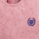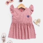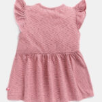 Pink striped A-line dress featuring a round neck, short flutter sleeves, and gathered detailing for a playful touch. Designed with an above-knee length and a flared hemline, this dress is crafted from pure cotton knitted fabric for breathable comfort and everyday wear.