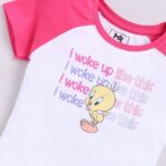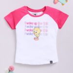 Add a dash of cartoon charm to your girl’s wardrobe with this white and pink Tweety printed T-shirt, designed to keep her comfortable and stylish all day long. Featuring a cute and colourful Tweety humour and comic graphic on the chest, this tee is perfect for young fans of classic cartoon characters.