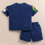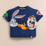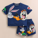 Add a playful edge to your casual wear with this Looney Tunes printed two-piece clothing set. It includes a AF blue and grey T-shirt featuring fun Looney Tunes graphics, a round neck, and short sleeves, paired with matching navy blue and grey printed shorts with a slip-on closure. Designed in a relaxed fit and crafted from pure cotton, this set ensures all-day comfort, breathability, and youthful styleâperfect for lounging, outings, or everyday wear.
