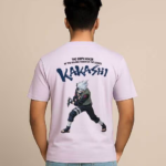 men’s Kakashi printed t-shirt, lavender anime graphic crew neck tee, regular fit short sleeve t-shirt, casual Naruto print top for men, soft Sinker fabric t-shirt, anime fan casual tee, medium length printed t-shirt, stylish men’s anime t-shirt, trendy Kakashi print t-shirt, everyday casual anime top for men.