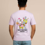 men’s SpongeBob printed t-shirt, lavender cartoon crew neck tee, regular fit short sleeve t-shirt, casual SpongeBob graphic top for men, soft Sinker fabric t-shirt, nostalgic cartoon fan t-shirt, medium length printed t-shirt, stylish men’s cartoon tee, trendy SpongeBob print t-shirt, everyday casual t-shirt for men.