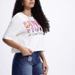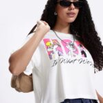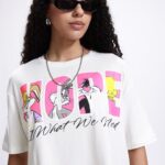 Looney Tunes crop t-shirt women, humour comic printed tee, white pink crop top women, cartoon printed t-shirt, Looney Tunes boxy top, casual crop t-shirt women, drop-shoulder cartoon tee, viscose rayon women’s t-shirt, trendy crop top for women, relaxed fit Looney Tunes tee