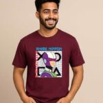 men’s Anime Nippon printed t-shirt, maroon anime graphic crew neck tee, regular fit short sleeve t-shirt, casual anime print top for men, soft Sinker fabric t-shirt, anime fan casual t-shirt, medium length graphic tee, stylish men’s anime t-shirt, Japanese anime-inspired printed shirt, everyday anime fan apparel.