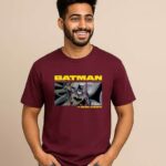 men’s Batman printed t-shirt, maroon superhero logo t-shirt, Batman logo crew neck tee, regular fit short sleeve t-shirt, casual superhero t-shirt for men, men’s Batman graphic tee, soft Sinker fabric t-shirt, stylish comic print t-shirt, everyday casual Batman top, trendy superhero print men’s t-shirt.