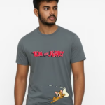 men tom and jerry t-shirt, cartoon graphic t-shirt for men, tom and jerry printed tee, men’s cotton crew neck t-shirt, charcoal grey cartoon t-shirt, nostalgic graphic print t-shirt, men’s casual animated t-shirt, fun pop culture t-shirt for men