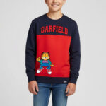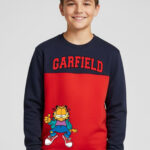 Let your little one step out in fun and comfort with this Boys Garfield Colourblocked Sweatshirt. Crafted from soft fleece fabric, this navy blue sweatshirt features a round neck, long sleeves, and a ribbed hem for a snug and comfortable fit. Designed in a pullover style with a regular length, it ensures warmth and ease for everyday wear.