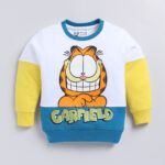 Keep her casual style fresh and fun with this Minute Mirth Girls Garfield Printed Sweatshirt. This eye-catching pullover features a cool color-blocked design in white, blue, and yellow, perfectly accented with a classic Garfield graphic. Crafted from soft, high-quality cotton, it features a cozy round neck and a ribbed hem for a snug, stay-put fit—ideal for school days or weekend lounging with everyone’s favorite lazy cat.