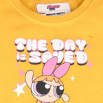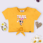 Bring playful charm to her wardrobe with this Minute Mirth Girls Powerpuff Girls Printed Crop Top. Featuring a vibrant mustard yellow shade, this crop top showcases a fun Powerpuff Girls graphic print, a round neck, and short regular sleeves. The stylish waist tie-ups add a trendy touch, while soft knitted cotton ensures comfort for everyday wear. Perfect for casual outings and fun-filled playdates.