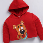 Solve the mystery of a perfect outfit with this Minute Mirth Girls Scooby-Doo Printed Sweatshirt. This rich maroon hoodie features a classic Scooby-Doo graphic on soft, breathable cotton fabric. Tailored in a modern crop length with a clean straight hem, it offers a trendy and sporty look that pairs perfectly with high-waisted joggers or jeans.
