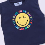Keep your little one cool and stylish with this Minute Mirth Girls Smiley World Printed Tank Crop Top. In a deep navy blue shade, this crop-length tank features a playful typography print, a classic round neck, and sleeveless design for comfort and ease. Made from soft knitted cotton, it offers breathable all-day wear. Perfect for casual outings, playtime, or layering on sunny days.