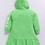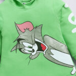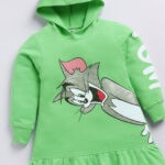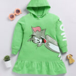 Add a splash of color and nostalgia to her wardrobe with this Minute Mirth Girls Tom and Jerry Printed A-Line Hooded Dress. This charming sea green “hoodie frock” features a playful graphic of the iconic cat-and-mouse duo on soft, breathable cotton fabric. With its cozy hood, long sleeves, and a fun flared hem that sits above the knee, it’s the perfect one-piece outfit for fans of the classic cartoon who want to stay comfortable and stylish.