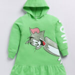 Minute Mirth Girls Tom and Jerry Printed A-Line Hooded Dress (Sea Green, Pack of 1)