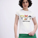 Add a playful touch to your wardrobe with this Minute Mirth Women Powerpuff Girls Printed T-shirt. Made from soft knitted polyester, it features a round neck, short sleeves, and a vibrant Powerpuff Girls graphic print on the chest. Perfect for casual outings or daily wear.