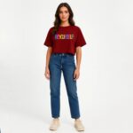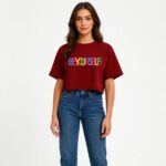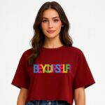 Make a bold and expressive statement with this MINUTE MIRTH Women’s motivational T-shirt. Set against a sophisticated Maroon base, the front features a vibrant, multi-colored typography design that reads “BEYOURSELF!” in a playful, overlapping block-letter style. Meticulously crafted from a high-quality Cotton Blend fabric, this tee provides a soft feel and comfortable breathability for all-day wear. It is tailored in a modern Boxy Fit with a slightly cropped length, making it a trendy and versatile choice for everyday Western Wear. The look is finished with a classic round neck and comfortable short sleeves for a relaxed, contemporary silhouette.