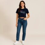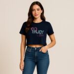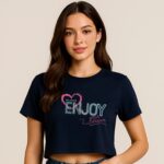 Define your style with a touch of inspiration in this MINUTE MIRTH Women’s typography top. Set against a classic Dark Blue base, the front features a modern, multi-textured graphic design. The design prominently displays the word “ENJOY” in a stylized, dotted font, accompanied by the phrases “this moment” and “your dream” in an elegant pink script. A charming pink heart outline ties the motivational look together. Meticulously crafted from a high-quality Cotton Blend fabric, this top offers a soft feel and breathable comfort for all-day wear. It is tailored in a trendy Boxy Fit with a cropped length, making it a stylish and versatile choice for contemporary Western Wear. The look is finished with a classic round neck and comfortable short sleeves.