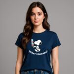 Features a playful Peanuts character graphic of Snoopy with an ice cream cone and a “Treat Yourself” typography print.
