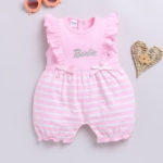 Barbie baby romper, light pink baby girl romper, Barbie print romper, infant girls summer romper, interlock cotton romper, Barbie baby outfit, soft cotton onesie 6–9 months, baby girl rompers India, Barbie infant wear, cute pink baby romper