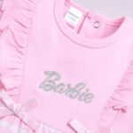 barbie print baby romper, pink baby girl romper, cute infant girl onesie, light pink cotton romper, barbie infant outfit, all season baby romper, 3–6 month baby girl clothes, interlock baby romper, newborn barbie romper, soft cotton baby wear