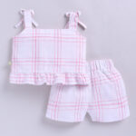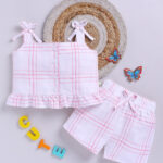 Keep your little one cool and stylish with this CHECKED Infant Girls Pure Cotton Top & Shorts Set. Made from soft, breathable cotton, the set features a white and blue checked top with shoulder straps and button closure, paired with matching white and blue checked shorts with a convenient slip-on closure. Perfect for casual outings, summer wear, or gifting.