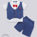 infant boys blue formal set, ML baby bow outfit, cotton summer set for boys, formal babywear, ML infant summer collection, interlock cotton clothing, soft breathable outfit, stylish boys babywear, blue cotton baby set, summer fashion for infants, formal infant suit, elegant baby bow outfit