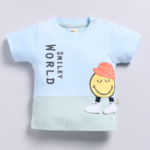 Smiley World baby clothes, baby boy powder blue outfit, cartoon print baby set, summer cotton baby set, interlock cotton suit, Smiley World infant wear, cute baby boy outfit, happy smile print baby set, comfy infant clothing, cheerful baby outfit