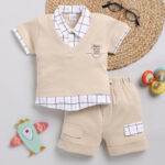 infant boys cotton t-shirt and shorts set, beige white baby set, shirt collar t-shirt with shorts, soft cotton casual set for infants, short sleeve t-shirt and slip-on shorts, comfortable everyday baby outfit
