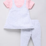 infant girls cotton dress and trousers set, striped tunic with solid trousers, grey pink casual baby set, soft cotton playwear for infants, short sleeve tunic with slip-on trousers, comfortable everyday baby outfit
