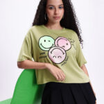Brighten your casual wardrobe with this Smiley World Printed Crop T-shirt for women. Styled in refreshing olive green and pink, this tee features a cheerful Smiley World graphic print that adds a touch of positivity and playfulness to your everyday look. The boxy fit and drop-shoulder sleeves create a relaxed, trendy silhouette, while the knitted viscose rayon fabric ensures soft comfort and breathability all day long.