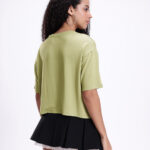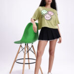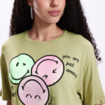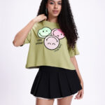 Smiley World printed crop t-shirt, olive green and pink women’s t-shirt, boxy fit graphic tee, Smiley World crop top, casual women’s printed t-shirt, drop-shoulder crop t-shirt, viscose rayon crop top, trendy smiley print t-shirt, cute crop tee for women, olive green smiley graphic top.