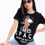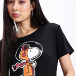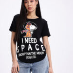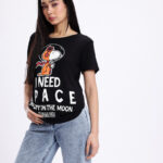 Peanuts printed T-shirt for women, black and white cartoon tee, Snoopy print T-shirt, comic print women’s top, Peanuts graphic T-shirt, cotton casual wear for women, regular fit round neck T-shirt, humour and comic print top, women’s printed T-shirt, Peanuts fashion apparel.