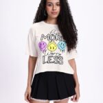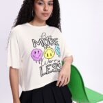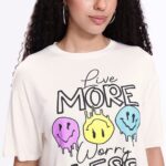 Bring cheerful energy to your casual wardrobe with this Smiley World Printed Boxy T-shirt for women. Featuring a bold black typography print on a white base, this tee captures the signature fun and positivity of Smiley World. Designed with a boxy silhouette and regular length, it offers a relaxed yet flattering look that pairs perfectly with jeans, shorts, or joggers. The round neckline and drop-shoulder short sleeves give it a trendy, laid-back appeal — ideal for both lounging and casual outings. Crafted from soft knitted viscose rayon fabric, this T-shirt ensures superior comfort, breathability, and a smooth feel against your skin. Stay cool, comfy, and effortlessly stylish all day long with this must-have Smiley World tee.