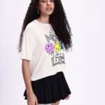 Smiley World t-shirt for women, white and black graphic t-shirt, typography print t-shirt women, Smiley World boxy top, drop shoulder t-shirt women, round neck casual tee, viscose rayon t-shirt, relaxed fit women’s top, stylish graphic printed t-shirt, trendy boxy t-shirt women, casual everyday t-shirt, women’s Smiley World print tee, breathable viscose t-shirt, summer casual wear, soft fabric women’s t-shirt, short sleeve drop shoulder top, cute casual top for women, comfortable women’s graphic t-shirt, fashionable boxy fit tee, women’s casual wear online