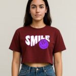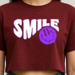 Smiley World women top, Smiley World typographic print top, boxy fit top women, casual Smiley World top, smiley print t-shirt for women, slogan printed top women, relaxed fit short top, round neck viscose top, trendy casual Smiley World crop, everyday wear women top, soft viscose printed top, happy vibe Smiley top, positive print women t-shirt, graphic slogan top women, stylish Smiley World apparel