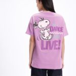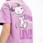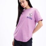 snoopy oversized t-shirt women, lavender snoopy tee, peanuts snoopy cotton top, back print oversized t-shirt, women’s casual cartoon tee, drop shoulder snoopy t-shirt