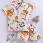 Tinyo boys set, Garfield printed shirt & shorts, yellow & orange boys clothing set, pure cotton boys outfit, shirt collar boys shirt, short sleeve shirt, elasticated slip-on shorts for boys, machine washable boys wear, Tinyo kids apparel