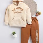 Elevate his casual style with this Tinyo Boys “Los Angeles” Hoodie Set. This warm coordinate set features a soft beige hoodie with a bold brown “Los Angeles California United States Legendary” graphic print on the chest, perfectly paired with contrasting brown sweatpants featuring “California” printed down the leg. Crafted from premium fleece fabric, this set is designed to provide essential seasonal warmth and a soft, plush feel for all-day comfort. The hoodie includes a functional hood and a spacious front kangaroo pocket, while the matching pants offer a secure fit, making it an ideal choice for practical and stylish winter wear.