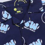 Keep your little one comfortable and cheerful with this TINYO Boys Smiley World Graphic Printed Pure Cotton Night Suit. Made from 100% soft cotton, it features a navy blue graphic printed shirt with a lapel collar, long sleeves, and button closure, paired with matching graphic printed pyjamas with slip-on closure. Perfect for bedtime, lounging, or gifting.