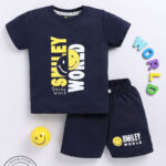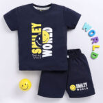 Tinyo boys set, Smileyworld printed T-shirt & shorts, navy blue boys clothing set, cotton blend boys outfit, round neck T-shirt for boys, short sleeve T-shirt, elasticated slip-on shorts for boys, machine washable boys wear, Tinyo kids apparel