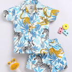 Keep your little one cool and stylish with this TINYO Boys Blue Tropical Printed Shirt & Shorts set. Crafted from soft pure cotton, the short-sleeve shirt features a classic collar and button closure, paired with matching tropical printed shorts designed with two pockets and a comfortable slip-on closure. Perfect for casual outings and playtime.