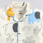 Gift your little one a cozy and relaxing bedtime with the Tinyo Conversational Printed Pure Cotton Night Suit for infant boys. This night suit features a cream-colored conversational printed shirt with a lapel collar and long sleeves, paired with matching pyjamas that have an elasticated waistband and slip-on closure for easy wear. Made from 100% pure cotton, the fabric is soft, breathable, and gentle on delicate skin. Designed in a regular fit, this night suit is perfect for bedtime or lounging at home and is easy to care for with machine wash.